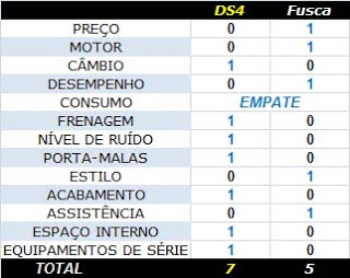 O Fusca chama mais atenção, tem mais motor, melhor desempenho, rede de concessionárias maior e ainda vende mais. Mas foi o DS4 quem levou a melhor no custo-benefício, por ter mais equipamentos a um preço mais em conta que o rival completo (o Fusca levou o ponto do preço básico), além de ter um câmbio automático de verdade, um acabamento melhor, ser mais espaçoso, seguro, silencioso e acomodar mais bagagens dos seus ocupantes. O duelo foi equilibrado só até a "página dois". A partir do terceiro item, ficou consolidada a vitória da razão e do requinte da linha DS da Citroën sobre a emoção de ter um Fusca turbinado.