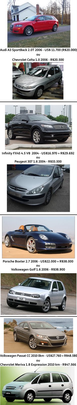 Comparativo com o preço de alguns carros aqui e lá.