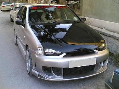 Não são só os brasileiros que xunam o Siena… Esse tá ao pior estilo NFS, com bodykit, 2 aerofólios (um de hatch acima do vidro traseiro e outro xunadão na tampa), capô "bedibói" preto, faróis modificados e rodões.